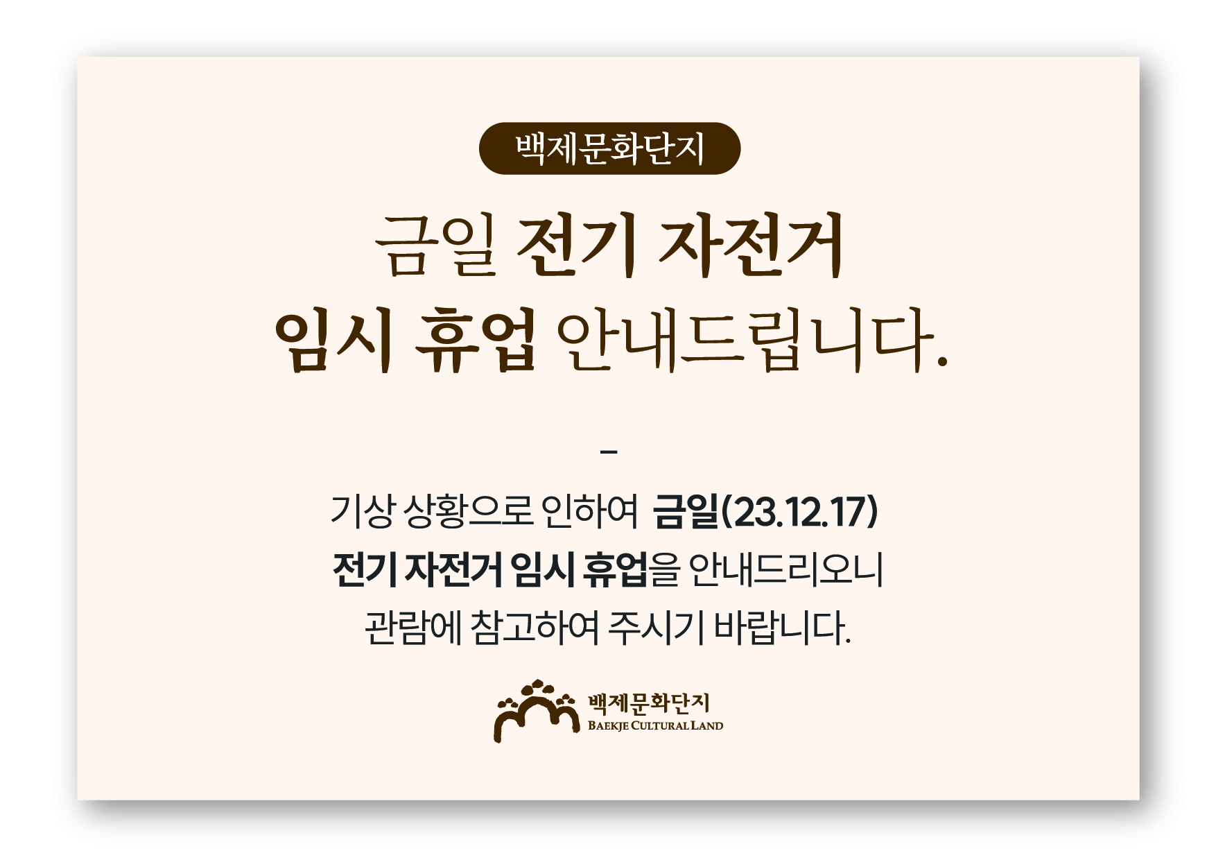 ±ÝÀÏ(23.12.17) Àü±â¾îÂ÷ ÀÓ½ÃÈÞ¾÷ ¾È³»